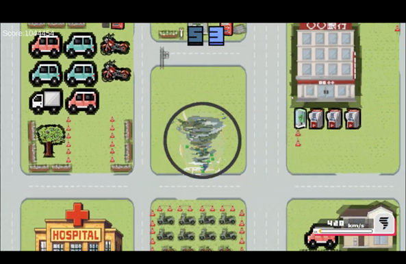竜巻で建物を巻き込むと、被害総額(スコア)が上がります。制限時間内に被害総額をできるだけ上げましょう!さらに、壊すとイベントが起きる特別な建物もあります!積極的に狙ってみましょう!